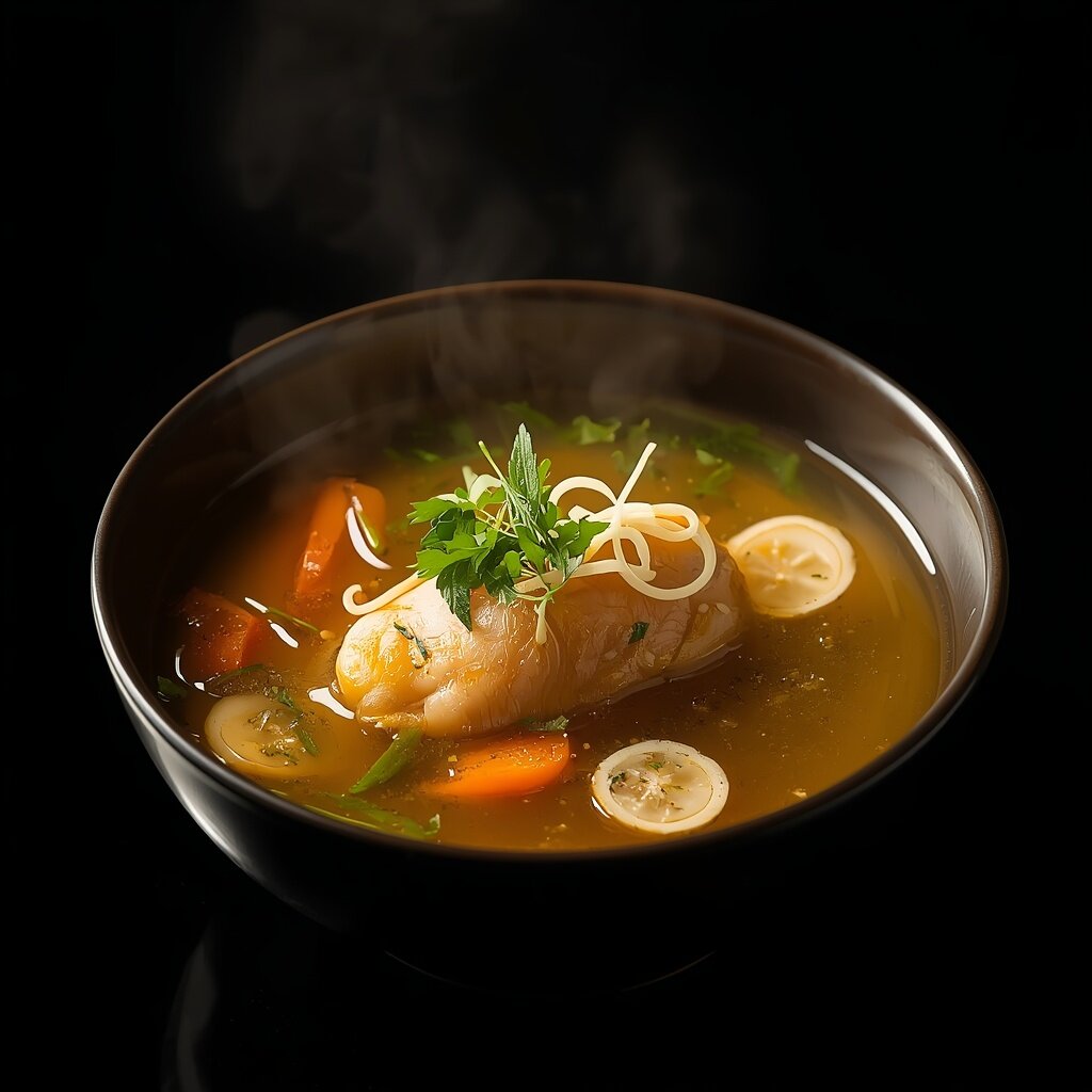 Склад: півень (мікс: кістка + філе), морква, цибуля, часник, імбир свіжий очищений подрібнений, курячий жир топлений, перець чорний мелений, лавровий лист, сіль йодована.